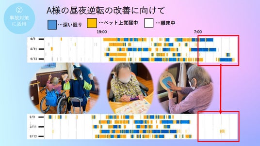 A様の睡眠データを活用して日中活動を調整した結果、昼夜逆転が改善された。