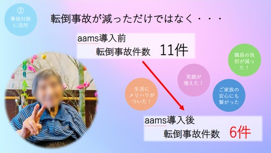 社会福祉法人元気村グループ(本社:埼玉県さいたま市、代表:神成 裕介)が運営する高齢者福祉・障害福祉サービス事業所「翔裕園」。そのグループ内施設の一つである特別養護老人ホーム「鎌ヶ谷翔裕園 (千葉県鎌ケ谷市)」にて「aams」の導入と活用法の見直しを行い、事故リスクの低減や昼夜逆転の改善、職員負担軽減といった成果を得た。