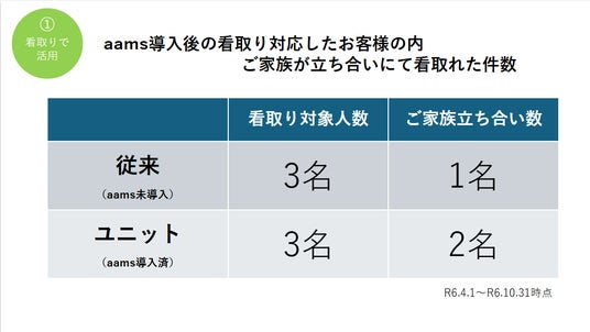 今後は、マニュアルの作成や職員教育のさらなる充実を図り、「aams」の活用を施設全体に広げていく予定である。具体的には、看取りに関するマニュアルを作成し、アラート対応のルールを明確化することで、一貫性のある対応を実現する。また、ICTやIoTの活用を進め、資料作成や日常業務の効率化を図ることで、介護職員の負担をさらに軽減していきたい。