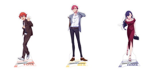 香水パッケージのために描きおろされた響裕太、レックス、ひめの新規イラストを使用したアクリルスタンドも香水に合わせて発売します!