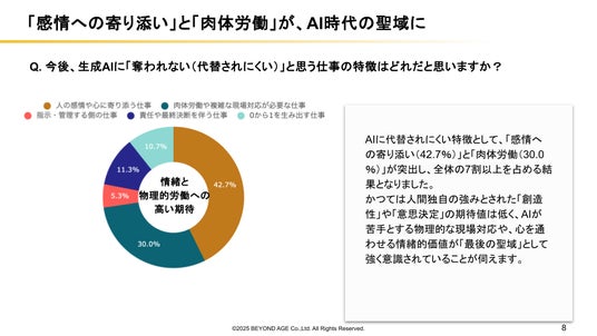 AIに代替されにくい特徴として、「感情への寄り添い(42.7%)」と「肉体労働(30.0%)」が突出し、全体の7割以上を占める結果となりました。