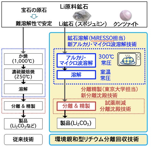 従来、リチウム鉱石(スポジュミン)からのリチウム化合物の精製には、鉱石溶解処理に1000℃のか焼処理と250℃の濃硫酸焙焼処理を要し、さらに、不純物分離及び化合物合成に多くの試薬を必要とします。MiRESSOの低温精製技術は、300℃で1回の熱処理のみで、鉱石の全溶解を可能にし、東京大学の新分離沈殿技術は、試薬量の大幅な削減を可能にします(図1参照)。