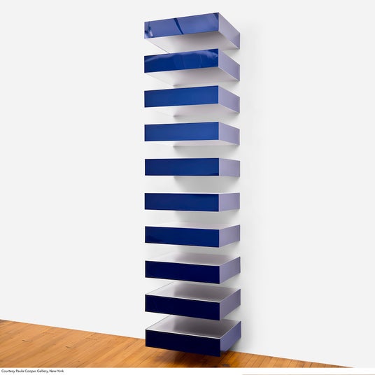 1980年代に入ると、ドナルド・ジャッドは素材、空間、色彩に関する深い探究を通じて、その表現を成熟させていきました。《Untitled》(1981)は、その成熟期の代表作として、内部に青いプレキシグラスを組み込んだ二分構造の銅製ボックスにより、新たな空間的・色彩的関係性を提示しています。これは、彼の象徴的な「1メートルボックス」構造の進化形でもあり、素材性や視覚性に対する姿勢の変化を示す作品であり、彼の後年の作品群にも影響を与える重要な一作です。さらに、《Untitled "stack"》(1988)は、鋼とブルーのプレキシグラスで構成されており、1988年に現オーナーが取得して以降、今回が初の市場公開となります。