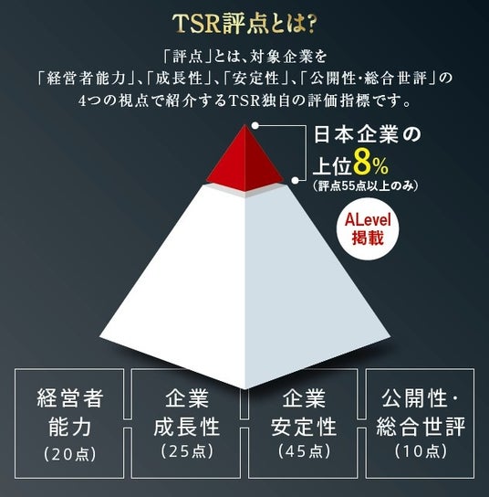 「評点」とは、対象企業を「経営者能力」、「成長性」、「安定性」、「公開性・総合世評」の4つの視点で評価するTSR独自の指標です。その総合点を5つのランクで位置づけています。