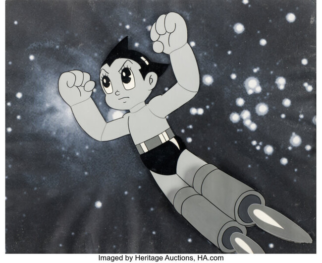「漫画の神様」として知られる手塚治虫氏によって創作された『鉄腕アトム』は、その後に続く多くのアニメ作品に大きな影響を与えました。このセル画は1963年に放映されたアニメのオープニング映像に使用されました。モノクロの『鉄腕アトム』のアニメーション・アートが市場に出回ることはほとんどなく、希少な代物です。