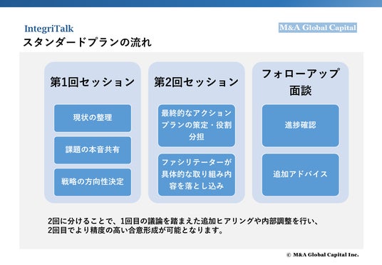 株式会社M&Aグローバルキャピタル(本社:東京都港区、代表取締役:目等 雄大)は、このたびM&A後の経営統合期に特化した新サービス「IntegriTalk(インテグリトーク)」をリリースいたします。本サービスは、M&A後に生じやすいコミュニケーションや企業文化のギャップを“本音対話”で解消し、組織の一体感とシナジー創出を早期に実現することを目的としています。
