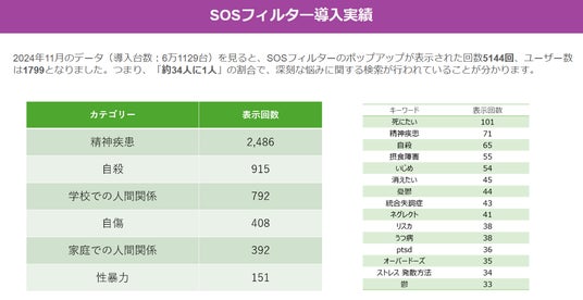 検索キーワードは、「自殺」「学校での人間関係(いじめ等)」「家庭での人間関係(虐待等)」「性暴力」「自傷」「精神疾患」と計6つのカテゴリーで、約5000個を設定。ブラウザは、「Google Chrome」と「Microsoft Edge」に対応しています。
