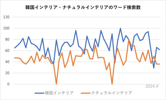 Googleトレンド検索によると過去1年間(2023年4月~2024年4月)の「韓国インテリア」と「ナチュラルインテリア」の人気度動向指数は3,770対2,426で、韓国インテリアが多い結果に。2020年の第4次韓国ブームの到来とともに広まった韓国インテリアは、Z世代から主婦世代まで幅広く受け入れられています。
