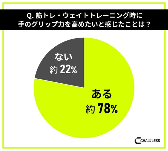 「手汗や手の滑りが気になった、もしくはプレイに支障があると感じたことがある」と回答した人は約78%、「感じたことはない」と回答した人は約22%、筋トレ・ウェイトトレーニング中の手汗や手の滑りを課題と感じている人は約78%でした。