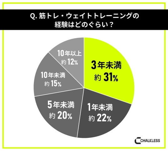 今回の回答者はおよそ3年未満が全体の約半数、5年未満~10年以上が約半数と、筋トレ・ウェイトトレーニングの初心者から熟練者まで、幅広い回答を得ることができました。