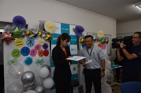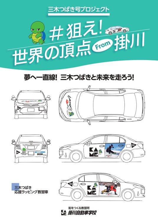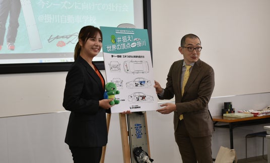 掛川自動車学校からは新マスコット「かけまる」のぬいぐるみ・ボード用新ステッカー、代表取締役社長・高部隼一より「つばきカー」のパネルボードの贈呈が行われました。「つばきカー」は教習車を入れ替えるタイミングで三木選手の写真がラッピングされる予定です(台数は未定)。