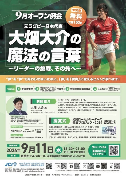 また、4月より実施している「姫路ローカルリーダーズ発掘プロジェクト2024~立ち上がれ若者たち!~」の授賞式も同時開催させていただきます。地域で活躍し豊かなまちの実現に取り組んでいらっしゃる方々を褒賞するものです。本例会では、グランプリ、準グランプリの方々には、活動PRを行っていただきます。