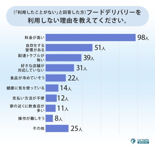 フードデリバリーサービスを利用したことがない149人に対して利用しない理由を調査したところ、「料金が高い」が98人で最も多く、価格が最大の障壁となっていることが明らかになりました。