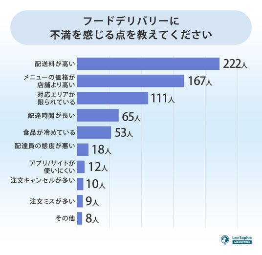一方、日常的な不満点としては「配送料が高い」という回答が222人と最も多く、次いで「メニューの価格が店舗より高い」が167人となっており、価格面での課題が特に大きいことが明らかになりました。