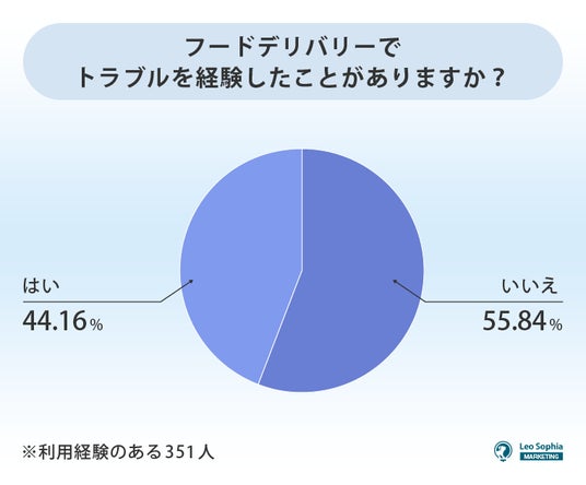 フードデリバリーサービスの利用経験者のうち、44.16%(155人)がなんらかのトラブルを経験していると回答し、その内容として「注文品が間違っていた」「配達員が予定時間を大幅に遅れた」がともに56人で最も多い結果となりました。