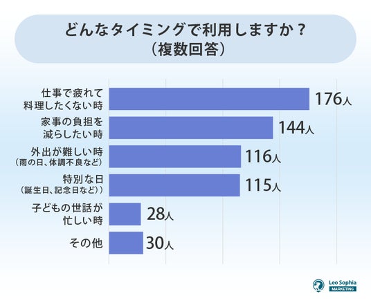 フードデリバリーサービスの利用タイミングについて調査したところ、「仕事で疲れて料理したくない時」が176人で最も多く、次いで「家事の負担を減らしたい時」が144人となり、日常生活における負担軽減のツールとして活用されている実態が明らかになりました。