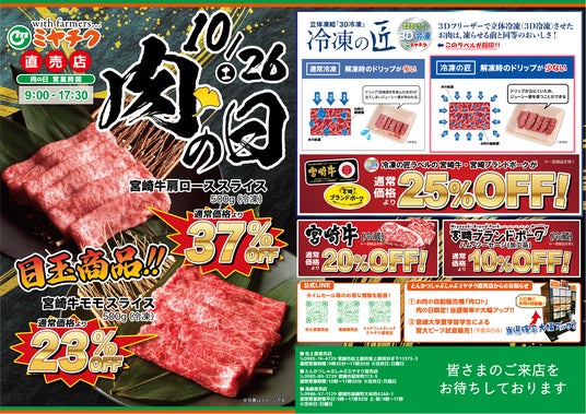 株式会社ミヤチク(本社:宮崎県都城市/代表取締役社長:船ヶ山 祐二)が運営する「宮崎牛」「宮崎ブランドポーク」「ハム・ソーセージ」を取り扱う直売店(宮崎県内3店舗)にて、10/26(土)にお肉が割引価格でお買い求めいただける「肉の日」を開催します。