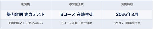 IBアカデミーは今後、合同実力テストを定期的に実施し、生徒一人ひとりの成長を継続的にトラッキングしていく予定です。テスト結果をもとに講師・運営が連携し、苦手科目への早期対応や学習計画の最適化を図ることで、IBスコアの向上と志望校合格をより強力にサポートしてまいります。 引き続き、生徒様一人ひとりに寄り添った高品質な指導環境の整備に努め、IB専門家庭教師サービスとしての価値向上に取り組んでまいります。
