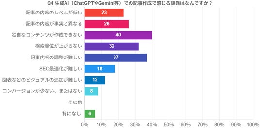 また、「検索順位が上がらない」「SEO最適化が難しい」という回答から、生成AIの記事がSEO効果や検索エンジンのアルゴリズムに十分対応できていないという課題も浮き彫りになっています。