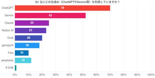 最も多くのユーザーが利用しているのは「ChatGPT」で全体の70%の方が使用されていました。次に「Gemini」が52%と続いています。また、ClaudeやNotion AI、Grokなどのツールも一定の利用者数があり、ユーザーが目的や特徴に応じて複数の生成AIを併用している可能性が高いです。