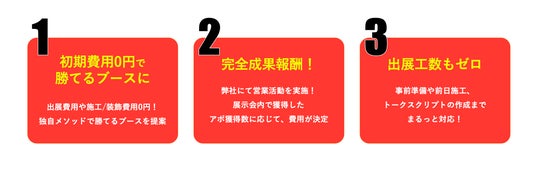 初期費用0円、成功報酬プランで展示会に出展できるサービス。出展のコマ代や基礎施工、装飾、当日のスタッフ1名まですべて弊社で負担し、展示会の成果に応じた金額での出展が可能になります。