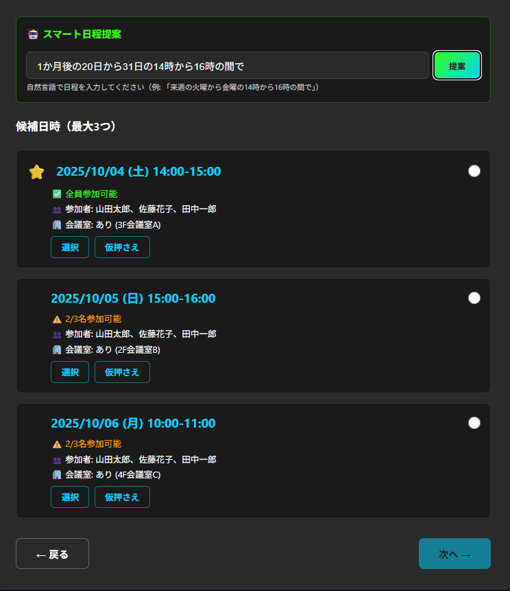 日程希望・参加者を自然言語で入力することで候補日を提案