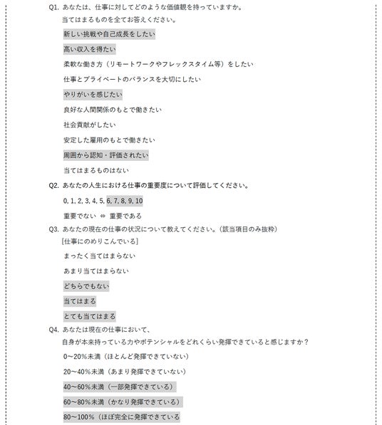 以下のQ1~Q4について、グレーに色付けした選択肢を“一切”選択していないサンプルを“静かな退職者と見なせる群”として扱う(1つでもグレーに色付けした選択肢を選択したサンプルは、当群には含まれない)。