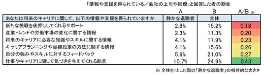 「仕事やキャリアに関して気づきを与えてくれる助言」については、その乖離のレベルは相対的に小さく、静かな退職者と見なせる群においても、当支援を得られていると回答した割合は10%を上回っていました。
