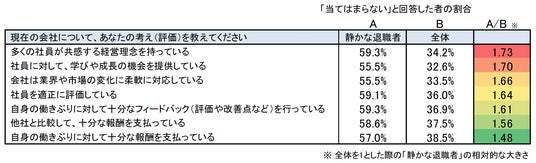 以下では「現在の会社について、あなたの考え(評価)を教えてください」という設問において、各項目に「当てはまらない」と回答した者の割合について、“静かな退職者と見なせる群”と全体を比較しています。