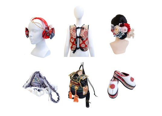 着物の生地等を活用した「SFDA」の作品 個性豊かで、着物の優美さが際立つデザイン (写真はファッショングッズ部門) 日本の伝統「着物文化」を、新たな着こなし、現代のファッションの力で持続可能(サステナブル)に継承