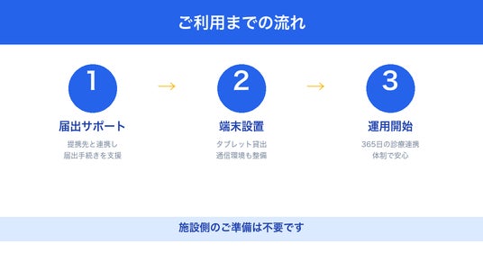 オンライン診療受診施設として運用を開始するためには、設置者は以下の準備を整える必要があります。連携する医療機関の確保、通信環境の整備、タブレット端末の用意、プライバシーが確保できる受診スペース、都道府県知事への届出書類の準備・提出が必要です。これらを設置者が単独で用意することは大きな負担となります。当社はこの「新制度を実際に動かすための準備」をワンストップで提供します。