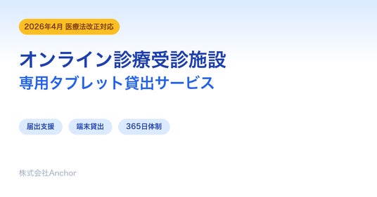 株式会社Anchor(本社:東京都港区、代表取締役:中村康宏、以下「当社」)は、2026年4月1日施行の医療法改正で新設された「オンライン診療受診施設」制度に対応し、専用タブレット端末の貸出を中心とした受診環境構築の導入サポートサービスの提供を開始しました。本サービスは、施設側でハードウェアや通信環境を新たに用意することなく、最短数日でオンライン診療の受診環境を整えられる「診療媒体サービス」として、特別養護老人ホーム、デイサービス、企業の健康管理室など幅広い設置者を対象としています。