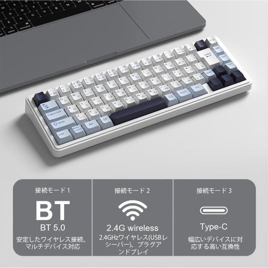 F65は、方向キーやよく使う機能キーを残しつつ、キーボード本体のサイズを効果的に抑えた65%のコンパクトレイアウトを採用しています 。従来のフルサイズキーボードと比較して、デスクスペースを約半分節約できます 。今回発売となるJIS配列モデルは、このコンパクトさを維持したまま日本語の入力環境を最適化し、専用ソフトウェアの日本語化も実現しました 。昨今、オフィス環境やデスク周りのデバイスがシンプルになるにつれ、キーボードのサイズや入力のしやすさに対するニーズは高まっています 。F65は、コンパクトな設計とJIS配列の組み合わせにより、空間の有効活用と快適なローカライズ体験を見事に両立させています 。