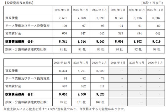 2026 年 2 月は、債権買取社数は新規で 1 社増加し、2 月末で 102 社となりました。投資資産残高は、買取債権が 228 百万円増加し、営業貸付金の回収があったものの、投資資産残高合計で前月末比 217 百万円増加し 9,523 百万 円となりました。