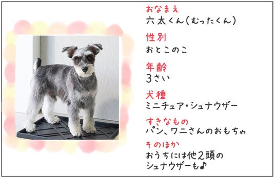 今回の主役は、ペットスマイルモデルとして抜擢されたミニチュアシュナウザーの「六太(むった)くん」。