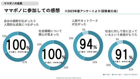 2023年度のアンケートでは、「ママボノへの参加経験についてどのような印象をお持ちですか?」という質問に対して回答者すべての方が「とても良い印象を持っている」「良い印象を持っている」と回答し、「自分の視野が広がり、人間的な成長につながった」「社会課題に対して関心が高まった」の項目に対しては回答者すべての方が「そう思う」「ややそう思う」と回答しました。