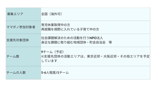 本説明会では、2024年度10-12月に実施する「ママボノ2024」の開催に向け、ママボノの紹介、開催概要、ご参加の流れをご説明します。また、昨年のママボノ経験者にご登壇いただきます。プロジェクトの様子、参加した感想、ママボノ参加後の変化など、支援をしたママの視点からお伺いします。