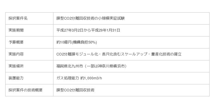 JOGMEC(本部:東京都港区、理事長:河野博文)は、平成26-28年度における技術ソリューション事業技術開発公募(技術開発・実証プロセス フェーズ2)において、「膜型CO2分離回収技術の小規模実証試験」を採択しました。