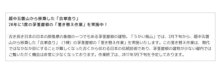 ※「うかい鳥山」は、2棟の「合掌造り」を保有しています。2月下旬からは茅葺屋根の葺き替え作業を予定。別紙にてご確認ください。