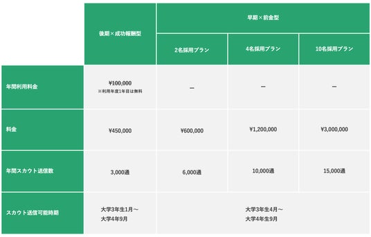 スカウト送信数・運用時期に制限があるものの、初期費用0円・月額費用0円・成功報酬45万円/名でご利用いただける「後期×成功報酬型」。リスクは少なからず伴いますが、採用単価30万円で抑えることができる「早期×前金型」の2つの料金体系をご用意しました。新卒採用市場を見渡しても、この料金でサービス提供をしている事業者はいないと自負しております。是非この機会に、Matcher Scoutの導入検討してみてはいかがでしょうか?