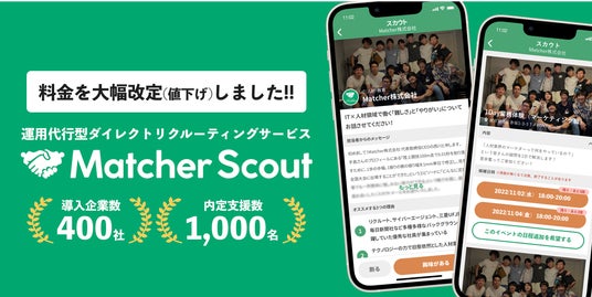 大学関係なくOB・OG訪問ができる就活アプリ「Matcher(マッチャー)」、新卒向け運用代行型ダイレクトリクルーティングサービス「Matcher Scout(マッチャースカウト)」を運営する、Matcher株式会社(本社:東京都港区、代表取締役社長:西川 晃平)は、この度より多くの企業様にご利用いただけることを目指し、「Matcher Scout」の料金を大幅改定したことをお知らせします。