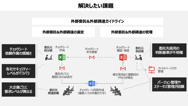 チェックシートの受領からチェック完了まで要する期間は1~2ヶ月ほどと長期的に行われることが多く、審査期間は各チェックシートの申請者とチェック項目に関するコミュニケーションを五月雨式にとっており、コミュニケーションのたびに過去の履歴を都度追う必要があるため、業務負荷が非常に高くなる傾向にあります。