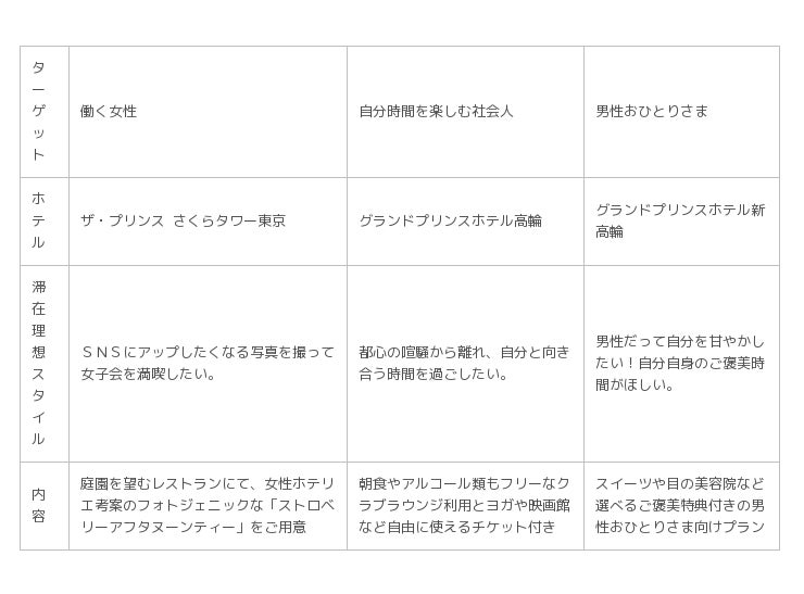 ザ・プリンス さくらタワー東京では、アフター3の時間を満喫する女性向けに、庭園を望むレストランでフォトジェニックなストロベリーアフタヌーンティーと、ブロアバス付きの客室でガールズトークをお楽しみいただけるプランをご用意しました。昨年11月にリニューアルオープンしたグランドプリンスホテル高輪では、ヨガやサウナ&ブロアバスなど過ごし方を選べる館内利用チケットが付き、緑が目の前に広がるクラブラウンジ(スイーツやアルコール類などがフリー)が利用できるクラブフロアのご滞在をお楽しみいただけます。そしてグランドプリンスホテル新高輪では、男性に金曜日の午後~土曜日を自分自身へのご褒美時間としてお過ごしいただける“おひとりさま”向け宿泊プランをおすすめいたします。