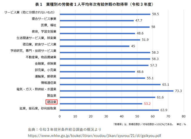 2019年、働き方改革の一環として年間5日間の有給休暇取得が義務化されるなどワークライフバランスの実現に向けた制度改正が進みましたが、その中でも建設業は休暇の取得率が他業界に比べ低い状態にあります(※表1)。2024年4月からは建設業でも完全週休2日制の導入が予定されており、建設業に従事する従業員の働き方にも抜本的な改革が求められています。