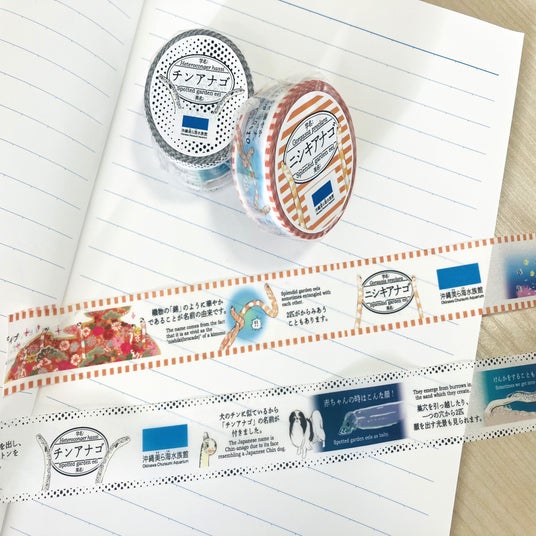 【画像左】オリジナルマスキングテープ(チンアナゴ)。【画像右】オリジナルマスキングテープ(ニシキアナゴ)。テープ表面にはアナゴの生態のひとこと解説が描かれていて、自分用はもちろん、プレゼント用にもおすすめ。
