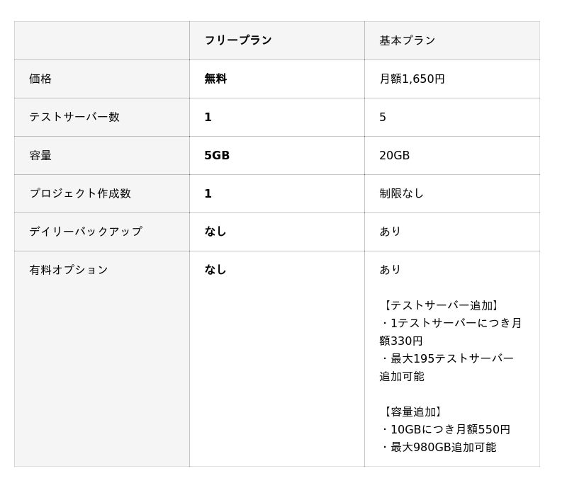 ※フリープランでは、テストサーバー数・サーバー容量の追加はできません。追加する場合は、基本プランにアップグレードする必要があります。