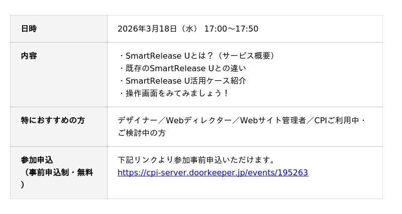 本サービス無償化の開始にあわせ、SmartRelease Uを徹底解説するオンラインウェビナーを開催します。機能の全体像や活用事例、実際の操作デモなどをご紹介します。