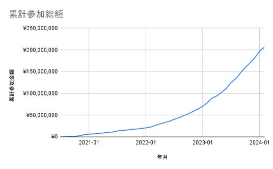 企画の増加に伴い参加総額も下記グラフに示す通り増加し、2024年2月、累計参加総額2億円を突破しました。