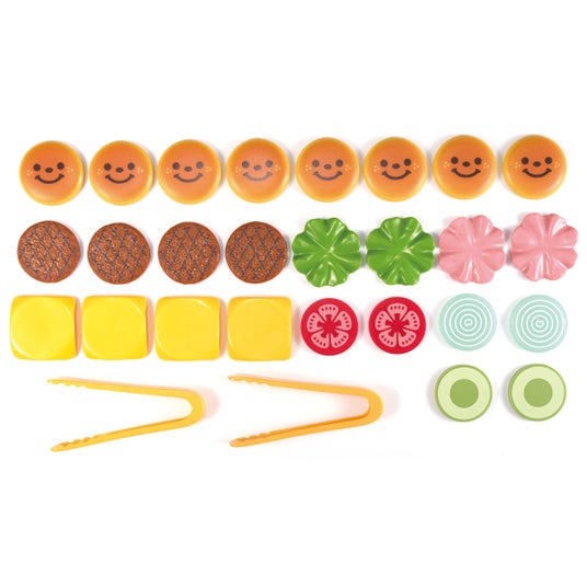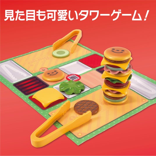 ボリューム満点のタワーゲーム5つの遊び方で楽しめるボリューム満点のバーガーゲームです。付属のプレイシートとトングでバーガーショップごっこも楽しむことができます!