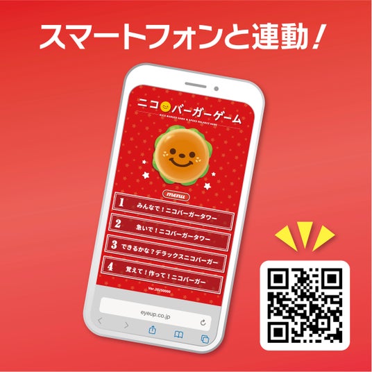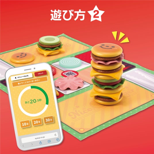 QRコードを読み込んでスマートフォンやタブレットと連動!スマートフォンやタブレットでQRコードを読み込むことで、4つのゲームで遊ぶことができます。 時間内にバーガーを高く積み上げたり、オーダー通りに正しく作ったりと、友達や家族みんなで盛り上がりましょう!